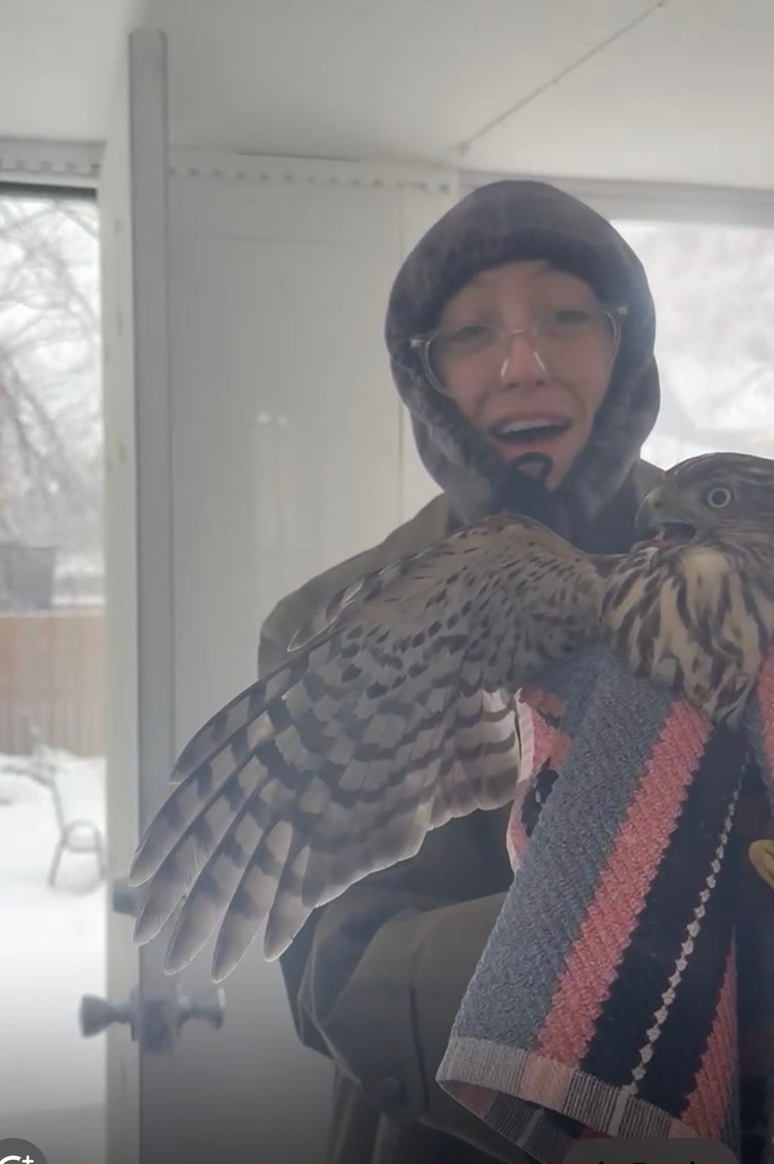 There’s been a little Cooper’s Hawk that has been in my backyard, normally just perched high in a tree, looking greedily at the neighbors’ chickens. It was the first true snow upstate. I was working from home, about to make myself lunch, when I heard a rustling off the screened-in porch. Then bam, there’s a hawk. Inside the porch. Chasing after a little finch. (I’m a huge bird nerd, and a former homeschool kid, this is my dream) With my partner filming, I don some blue light glasses, a hoodie cinched up tight around my face, and a towel to protect my hands.