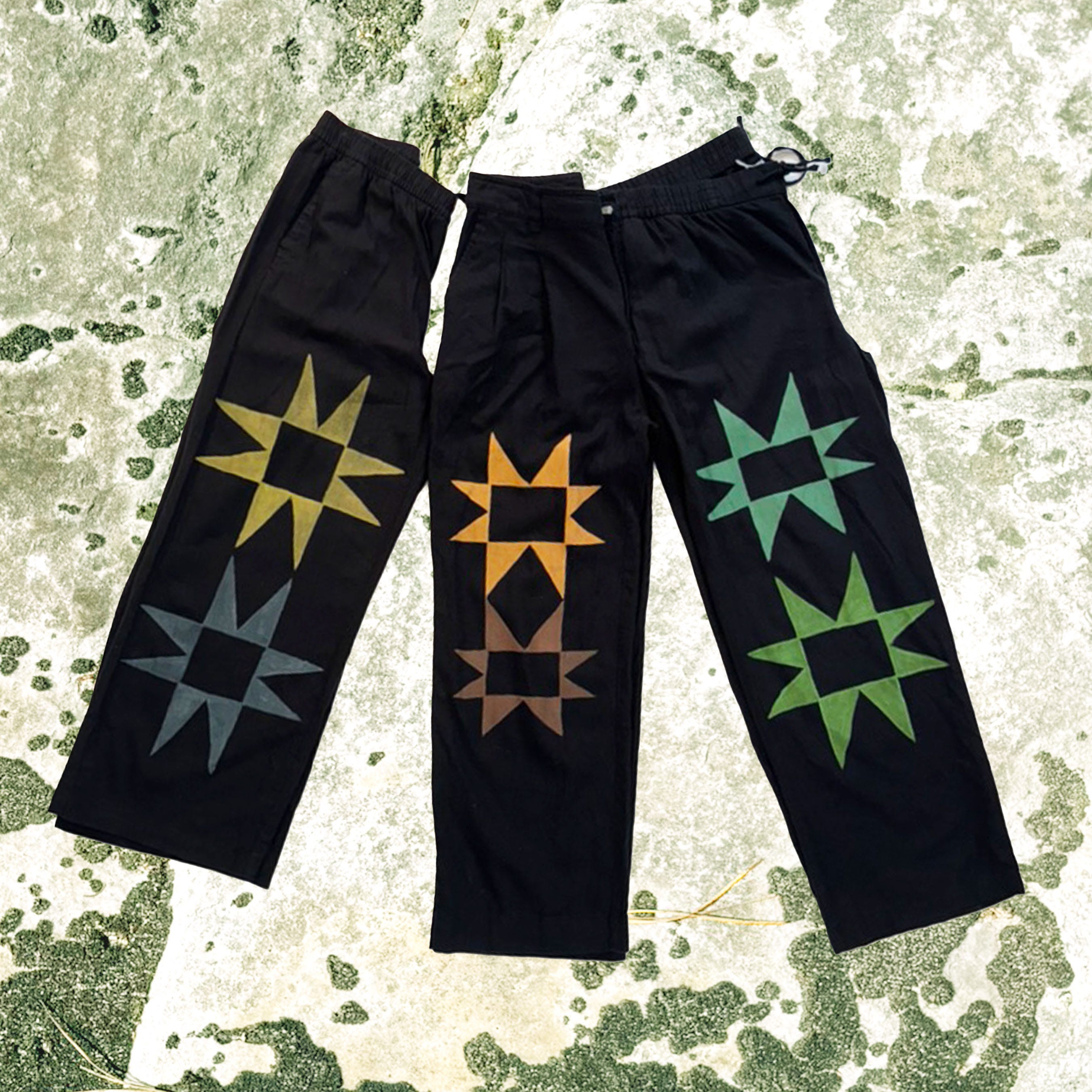 Personally my favorites from this collection have to be the sawtooth linen pants. Bold, graphic, and playful, these large painted quilt patches give so much character to an outfit. Soft mono-chrome or bright vintage colors. Dealer’s choice.