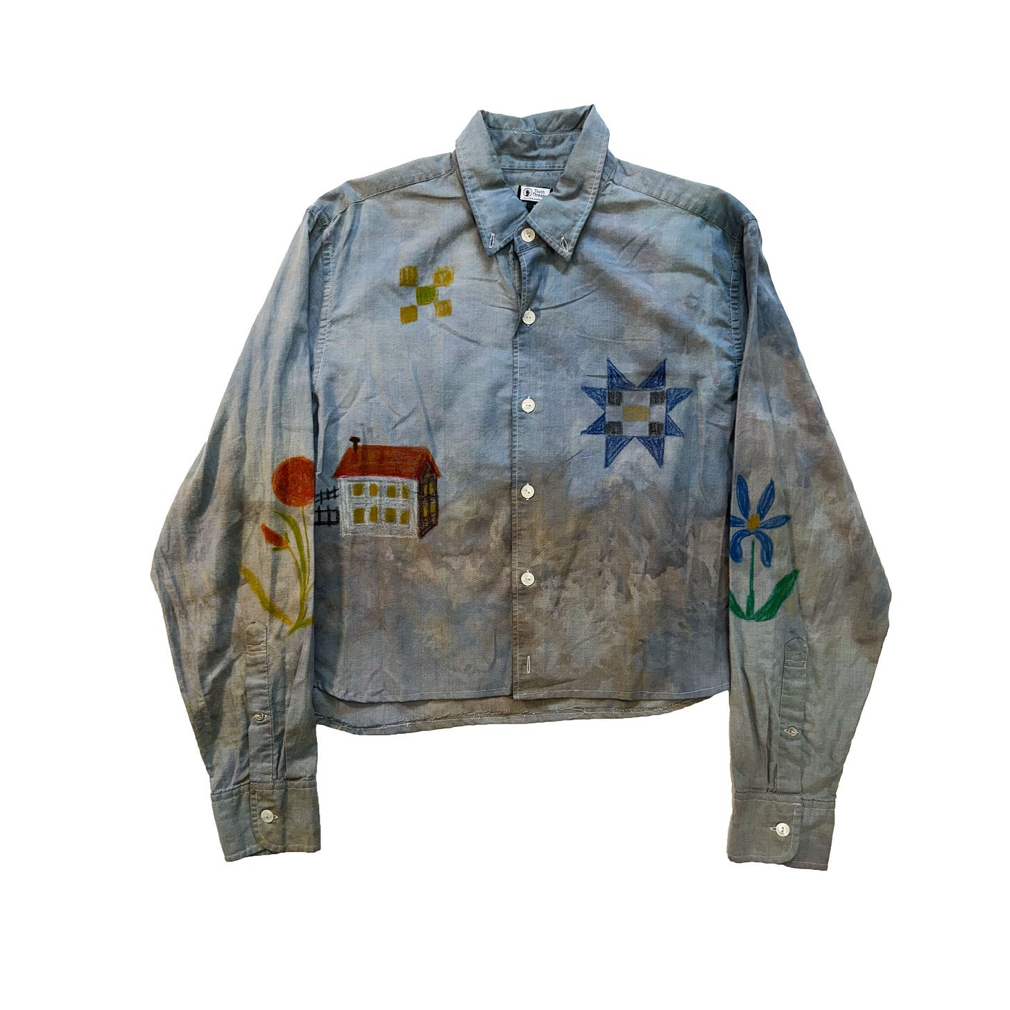 Final featured item is unique, I was gifted vintage fabric pastels a while back. These are just like paper pastels and the colors, mix, and hand of each drawing really changed for each item. It’s siblings have sold but I’d love to make more doodled shirts.